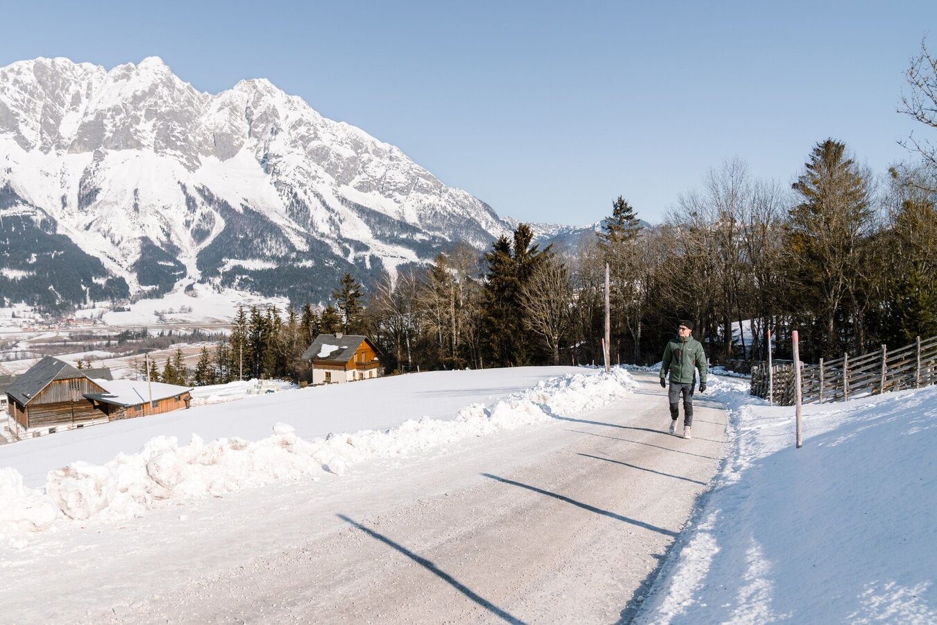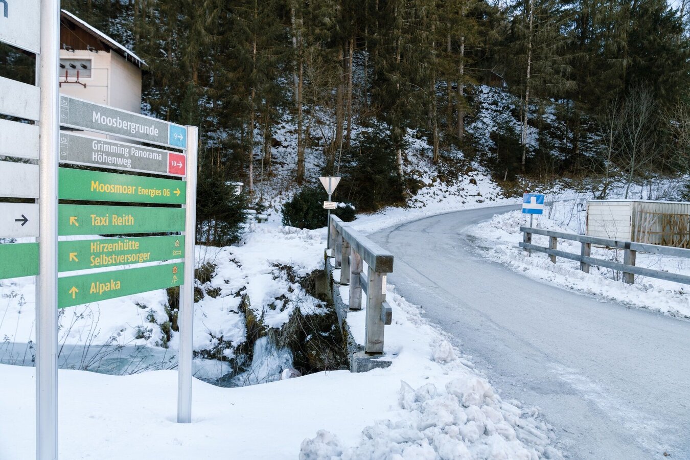 From the Gasthof Grimmingtor follow the road into the valley to the Moosberg junction at the Moosbergbrücke. You walk along the Moosberg supply road over a few serpentines to the Grimminger Panorama Höhenweg (GPHW) junction at vlg. Moosmoar. Here you turn right and walk past a single house above the "Schulgraben" rift to the driveway from the Webersberger farm. Here you follow the Moosbergstraße uphill to the Gatschberger farm and then steadily downhill in the direction of Sonnberg. After a bit through the forest, you turn right onto the private path to Murberger farm. Continue downhill past the farm and then down the access road from Murberger to the old Niederöblarn state road. Past the Ripplmaier farm you walk back into town to the parking lot at the Gasthof Grimmingtor.